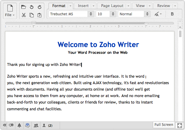 Nuestro procesador de textos luce una nueva, refrescante e intuitiva interfaz de usuario. Es el procesador de textos diseñado para usted: la nueva generación. La forma rápida y revolucionaria de trabajar con documentos. Tener todos sus documentos en línea (y fuera de línea también!), Usted tiene acceso a ellos desde cualquier computadora, en casa o en el trabajo. Y no más que un correo electrónico de ida y vuelta a sus colegas, clientes o amigos para su revisión, gracias a su colaboración instantánea en línea.
